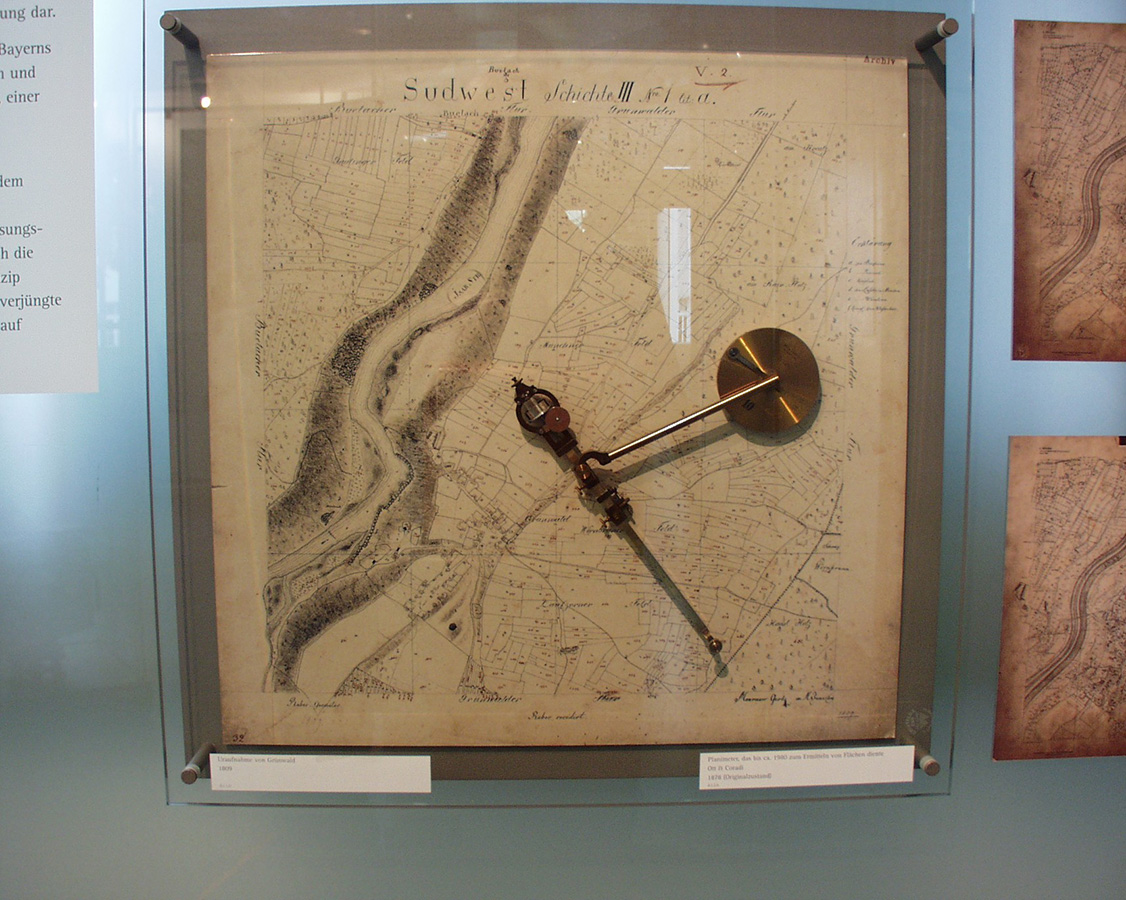 Vor 200 Jahren kam dem bayrischen Trigonometer Johann Martin Hermann (1785-1841) die Idee zum ersten Planimeter. Das Instrument konnte den Inhalt einer Fläche, deren Grenzen krumm und unregelmäßig verlaufen, erstmals exakt berechnen. In den Anfangsjahren der bayrischen Landesvermessung war dies von großer Bedeutung für die Steuerberechnung. Ein Planimeter fährt die Grenzlinien eines Grundstücks auf einer Zeichnung ab und ermittelt den Flächeninhalt mechanisch mittels kontinuierlicher Multiplikation, also Integralrechnung.