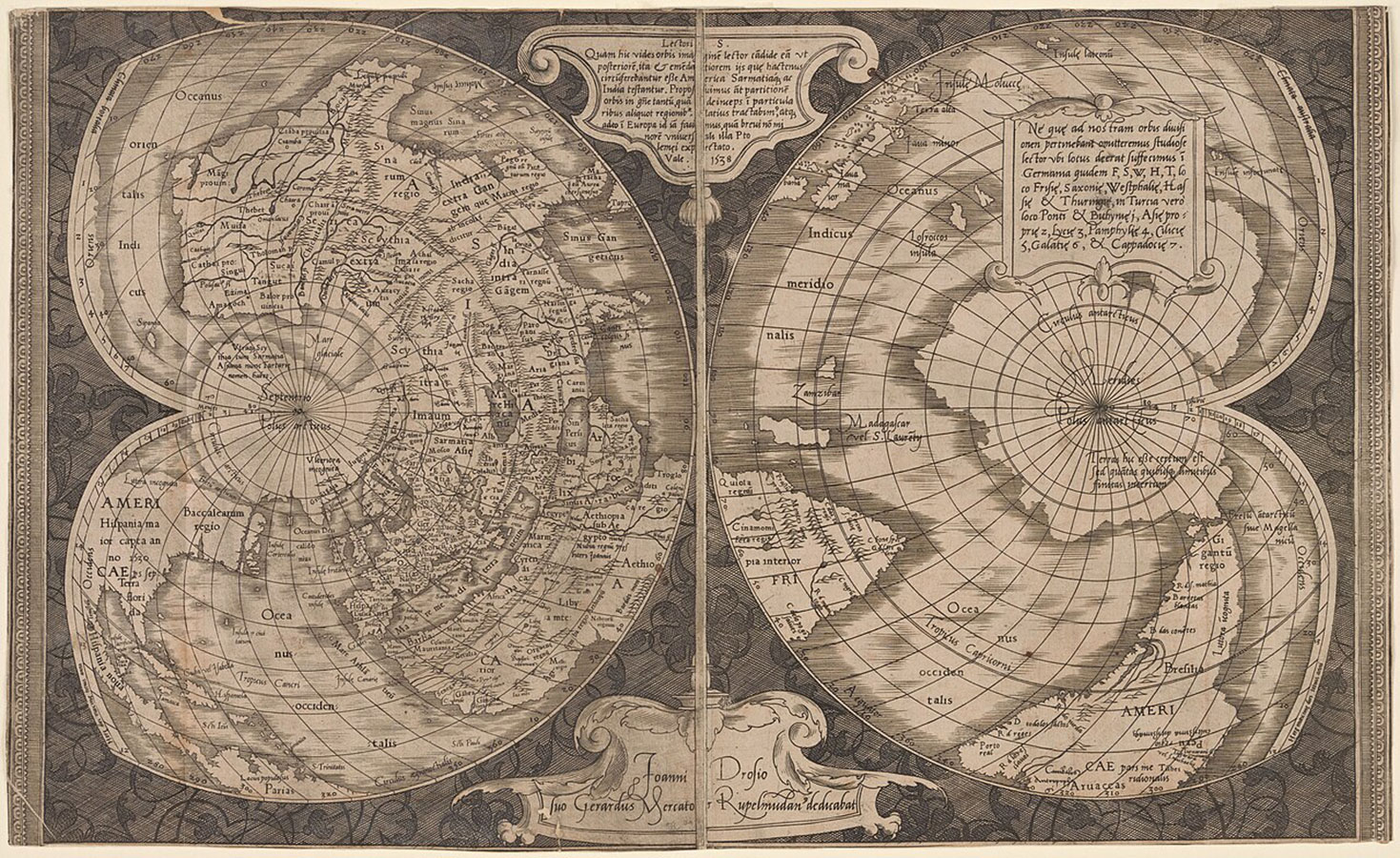 Mercators Karte bezeichnet erstmals Nord- und Südamerika einheitlich als Doppelkontinent „America“. Die herzförmige Weltkarte erschien 1538 als Einblattdruck, sie wurde in Kupfer gestochen und wies die Maße 54,5 x 35,5 Zentimeter auf. Die Karte verkaufte sich damals gut und langanhaltend. Heute sind von dieser besonderen Karte jedoch nur noch zwei Exemplare erhalten, die in der New York Public Library und in der University of Wisconsin-Milwaukee aufbewahrt werden.